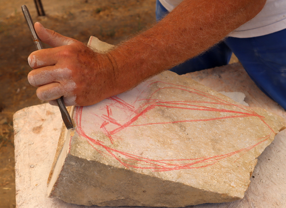 Damit arbeitet man feine Linien in den Stein, zum Beispiel den Umriss einer Hand, einzelner Finger, oder in diesem Fall den Umriss einer steinernen Eule